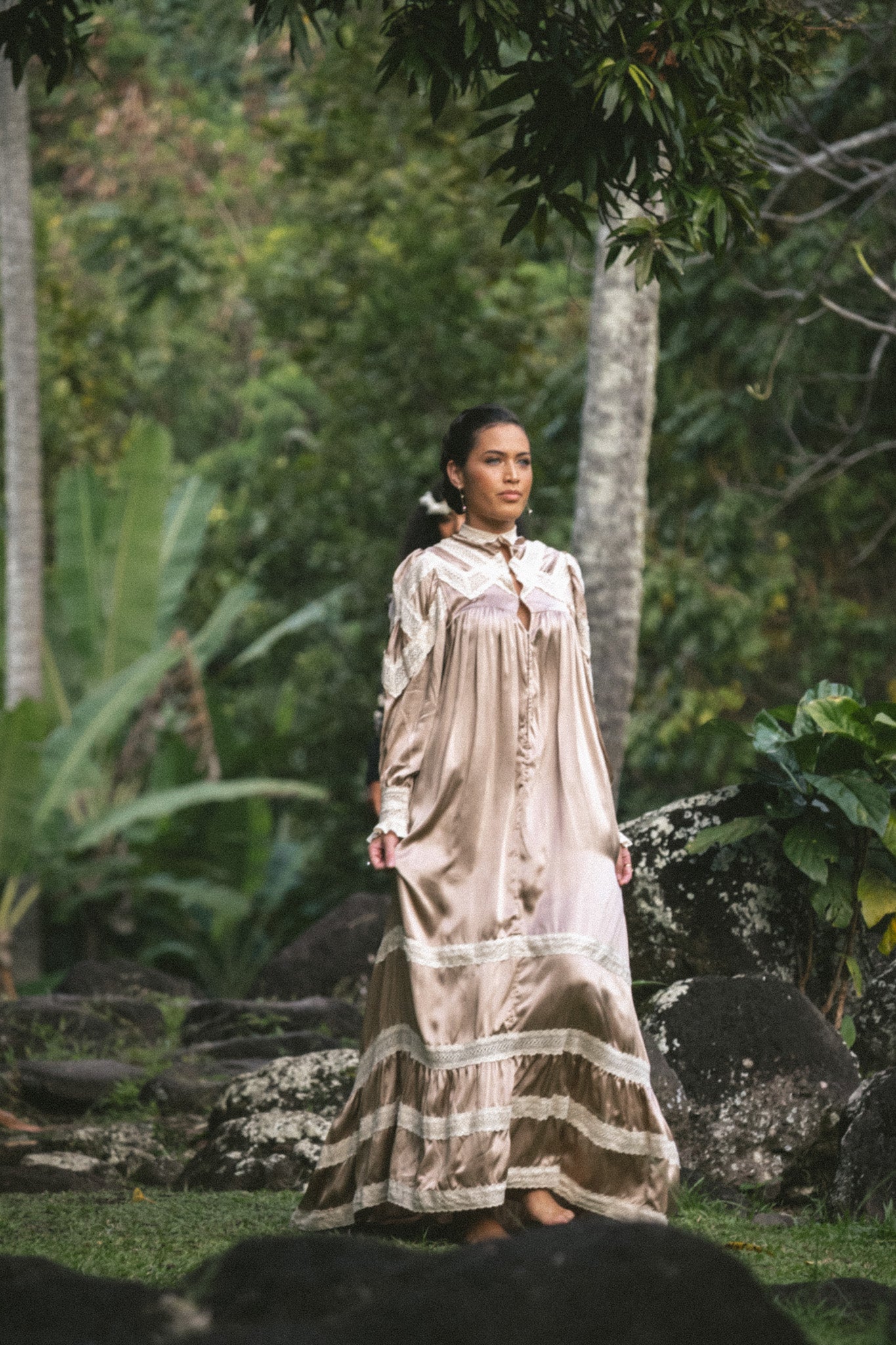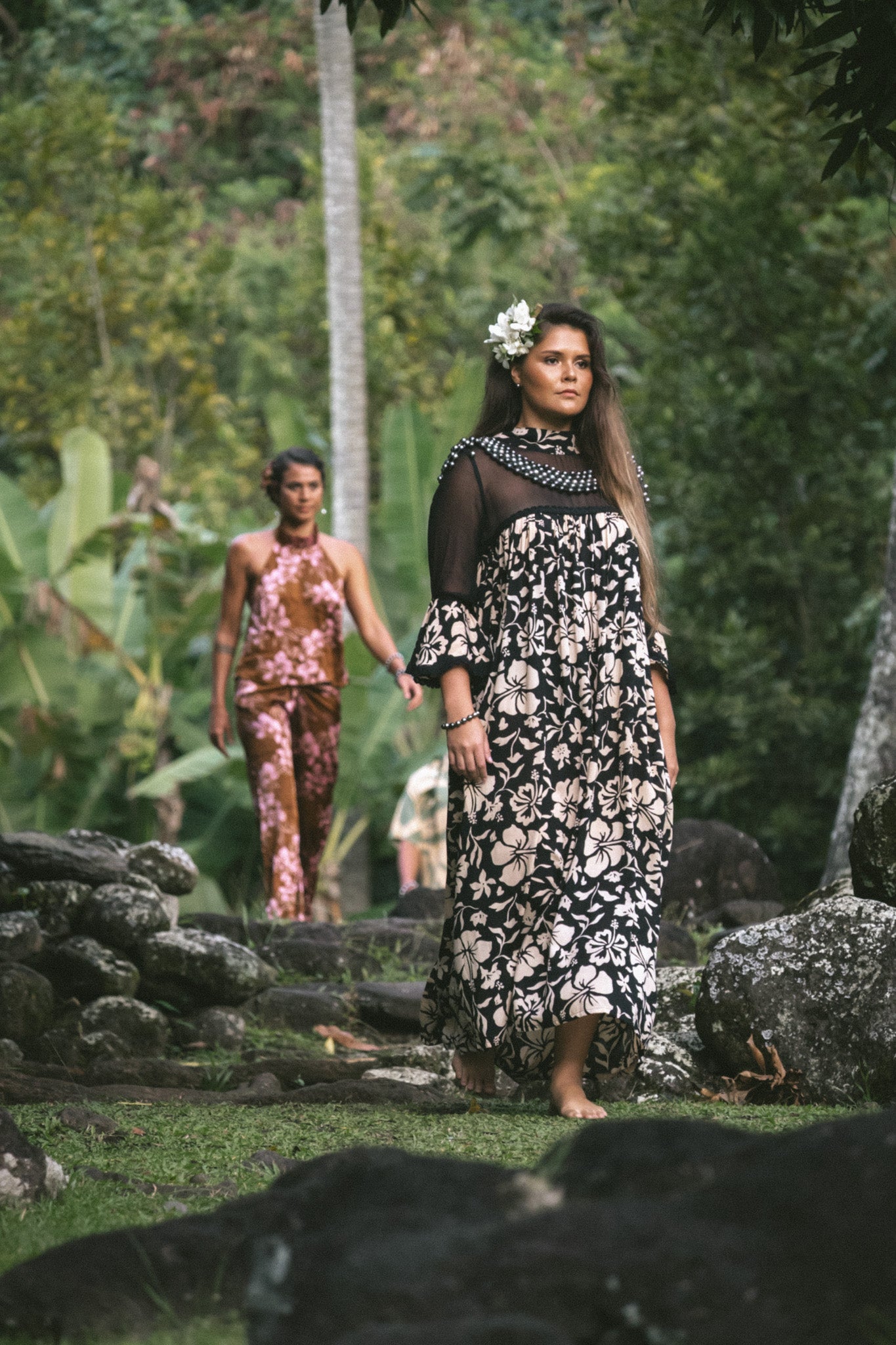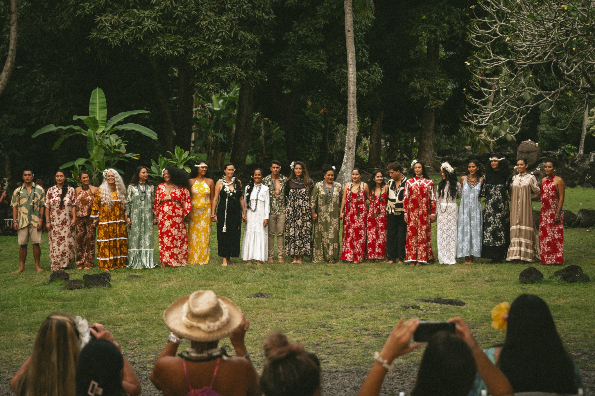 The festivity began with a powerful 'ōrero by our radiant ambassador, Hinatea Colombani, whose words set the tone for a celebration of culture, artistry, and ancestral wisdom. At the heart of the experience was Matavai, EIMEO’s new collection, a luminous dialogue between heritage and contemporary design. The collection revealed Heritage mu‘umu‘u dresses, flowing with elegance and nostalgia, alongside modern silhouettes that reimagined Polynesian style for today.