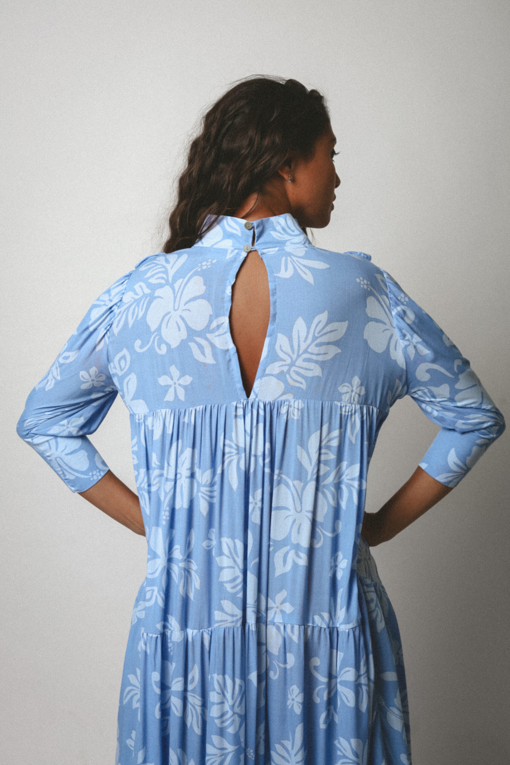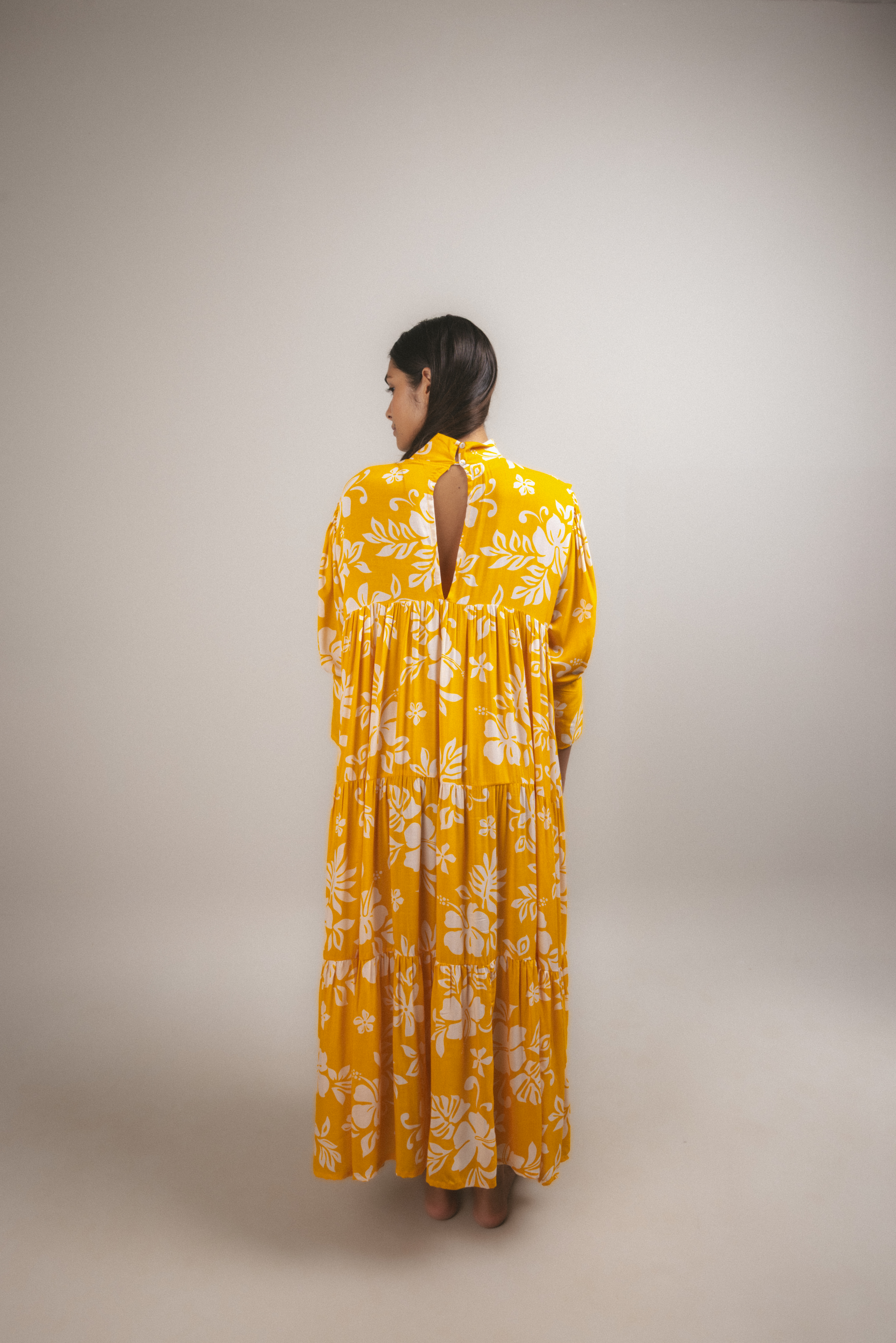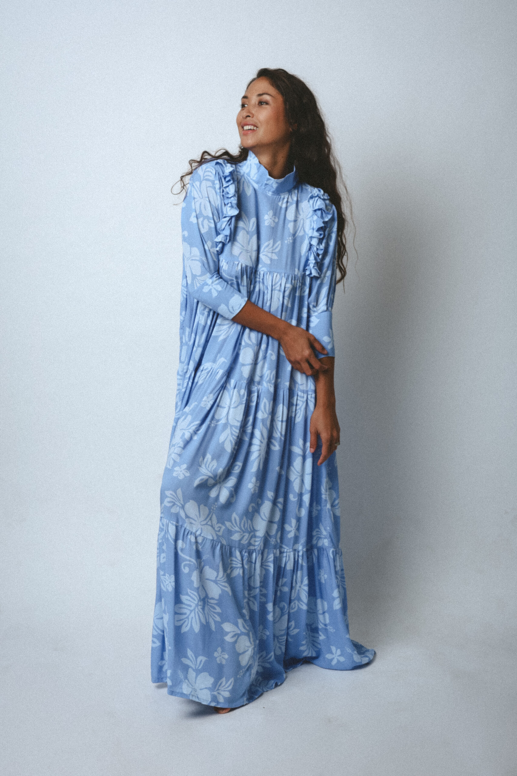 Inspired by the traditional muʻumuʻu, the Ha’a Dress reimagines Polynesian elegance with a long, flowing silhouette, high collar, and tiered smock design that flatters every body type.
