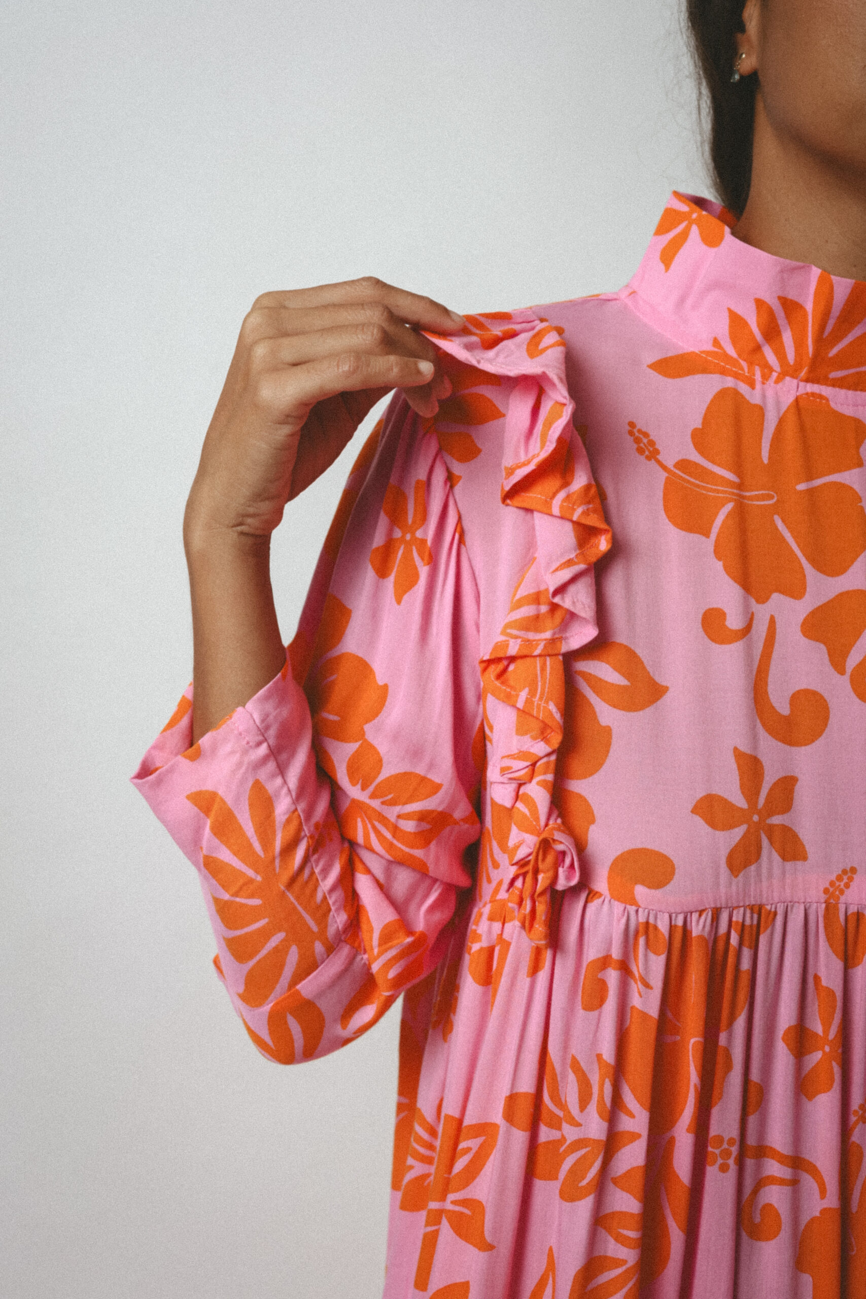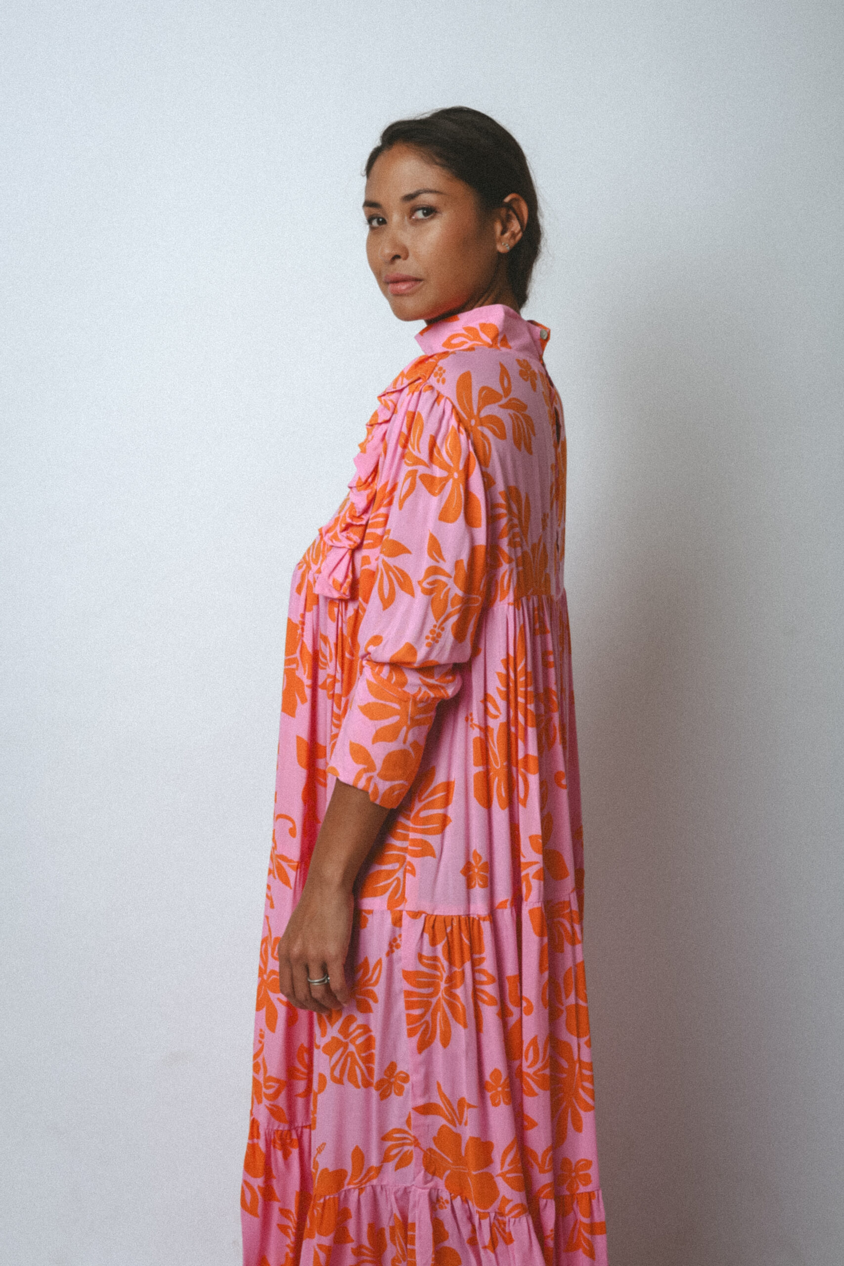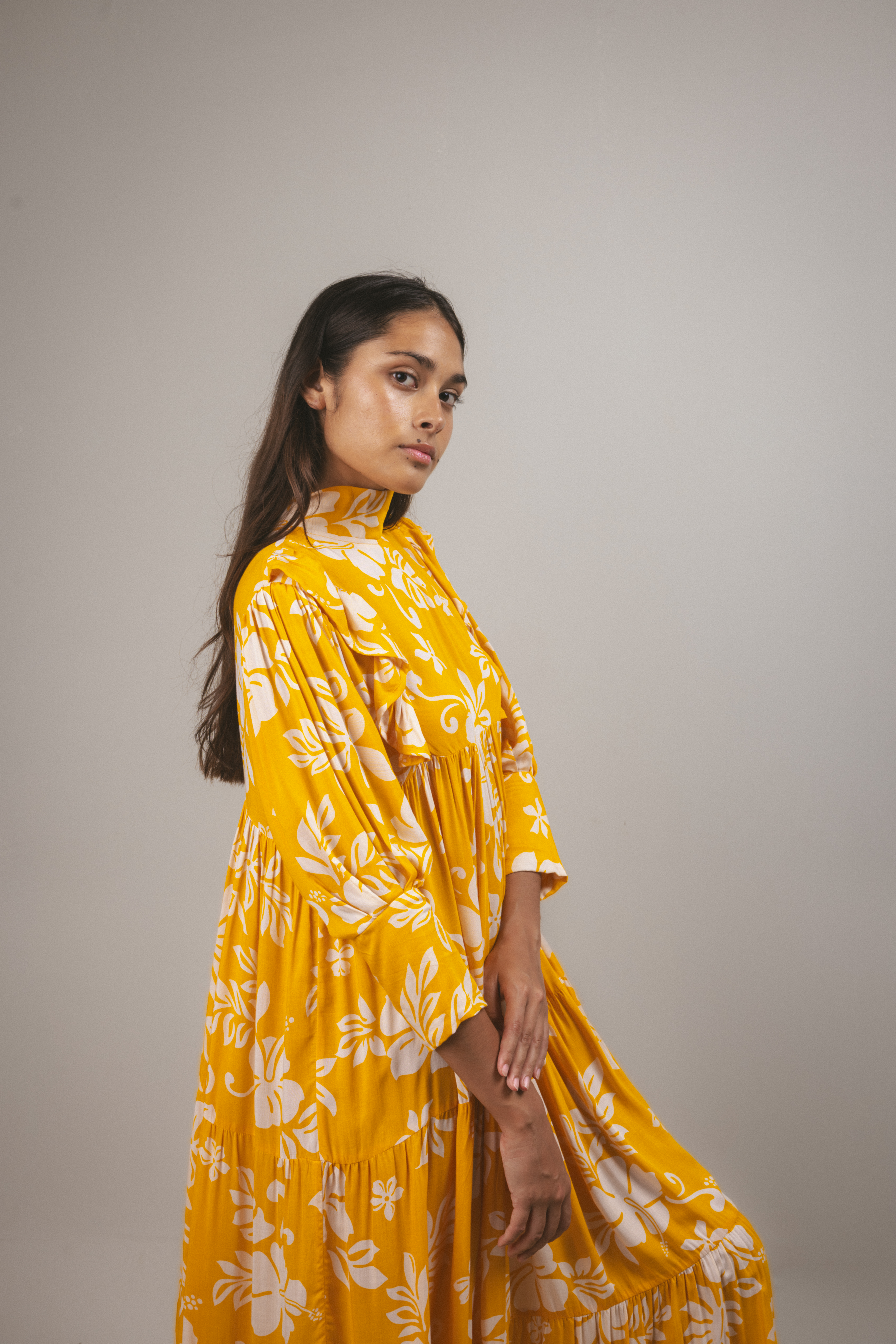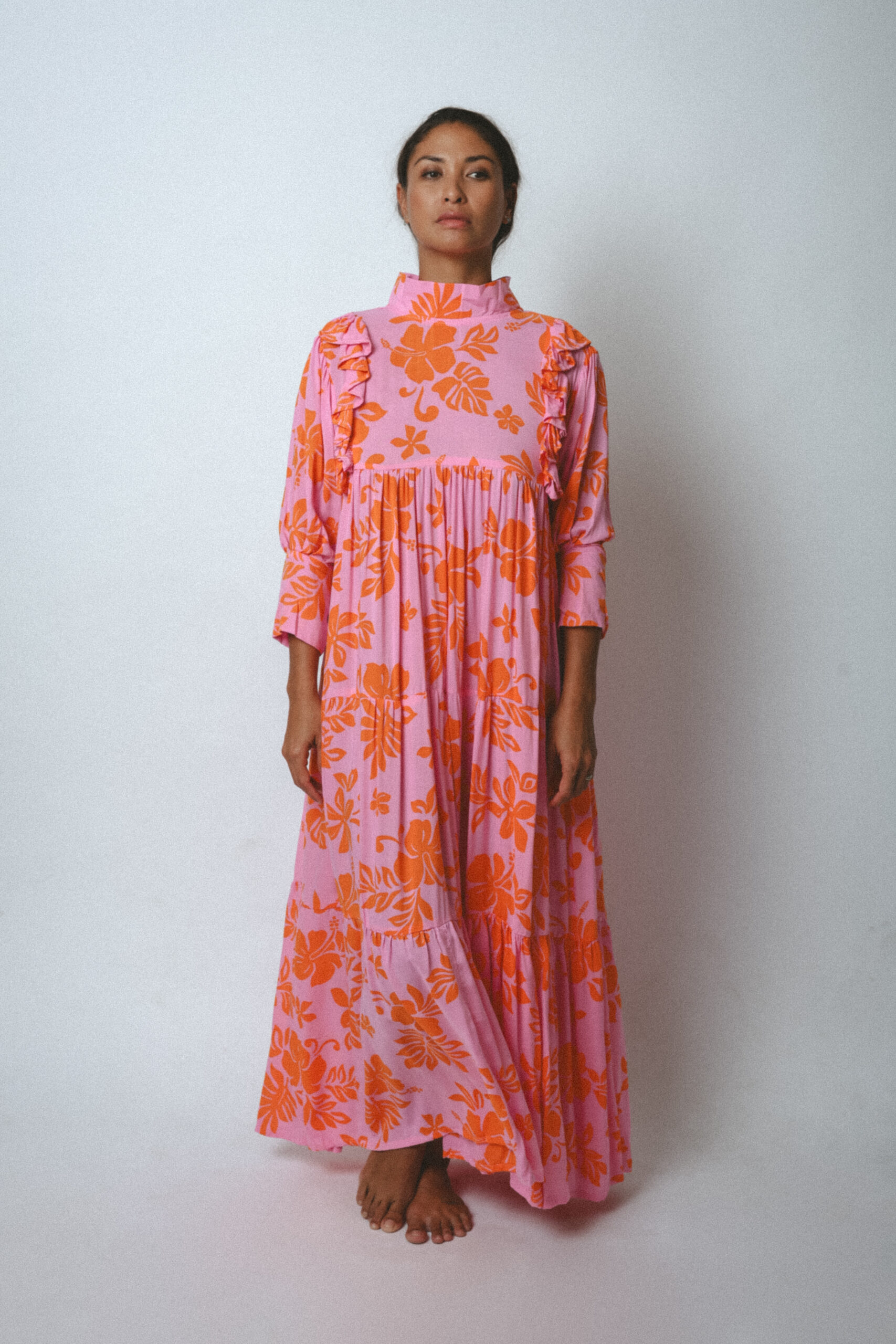 Inspired by the traditional muʻumuʻu, the Ha’a Dress reimagines Polynesian elegance with a long, flowing silhouette, high collar, and tiered smock design that flatters every body type.