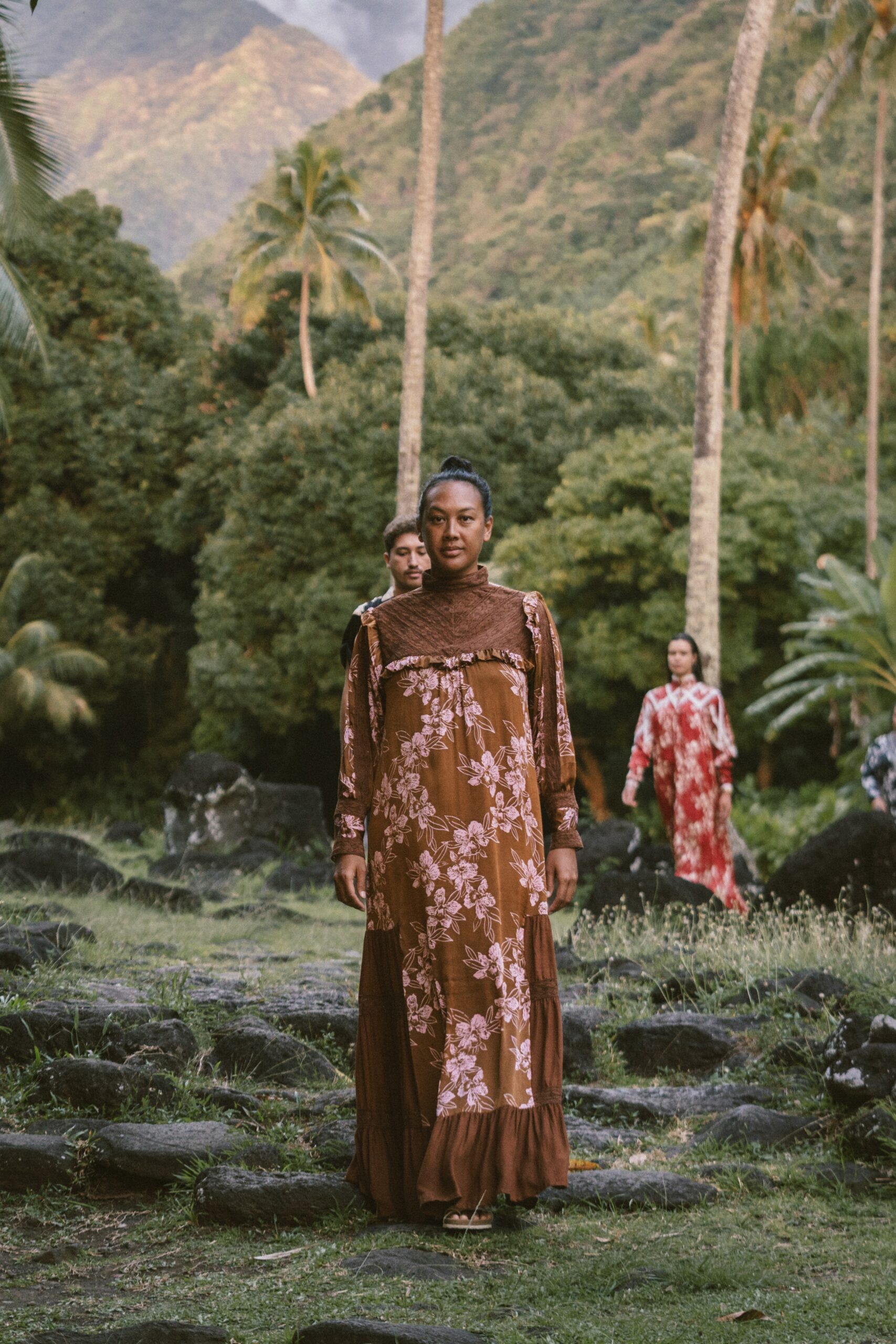 The POMARE dress is the most regal piece of the Matavai Collection, echoing the missionary era with its modest, flowing silhouette. Crafted in luminous silk, it features lace, ruffles, long sleeves, and a high neckline, with plain fabric meeting the Oka floral motif at the hem. Named for the Tahitian royal dynasty, POMARE unites memory and tradition in a timeless expression of Polynesian elegance.