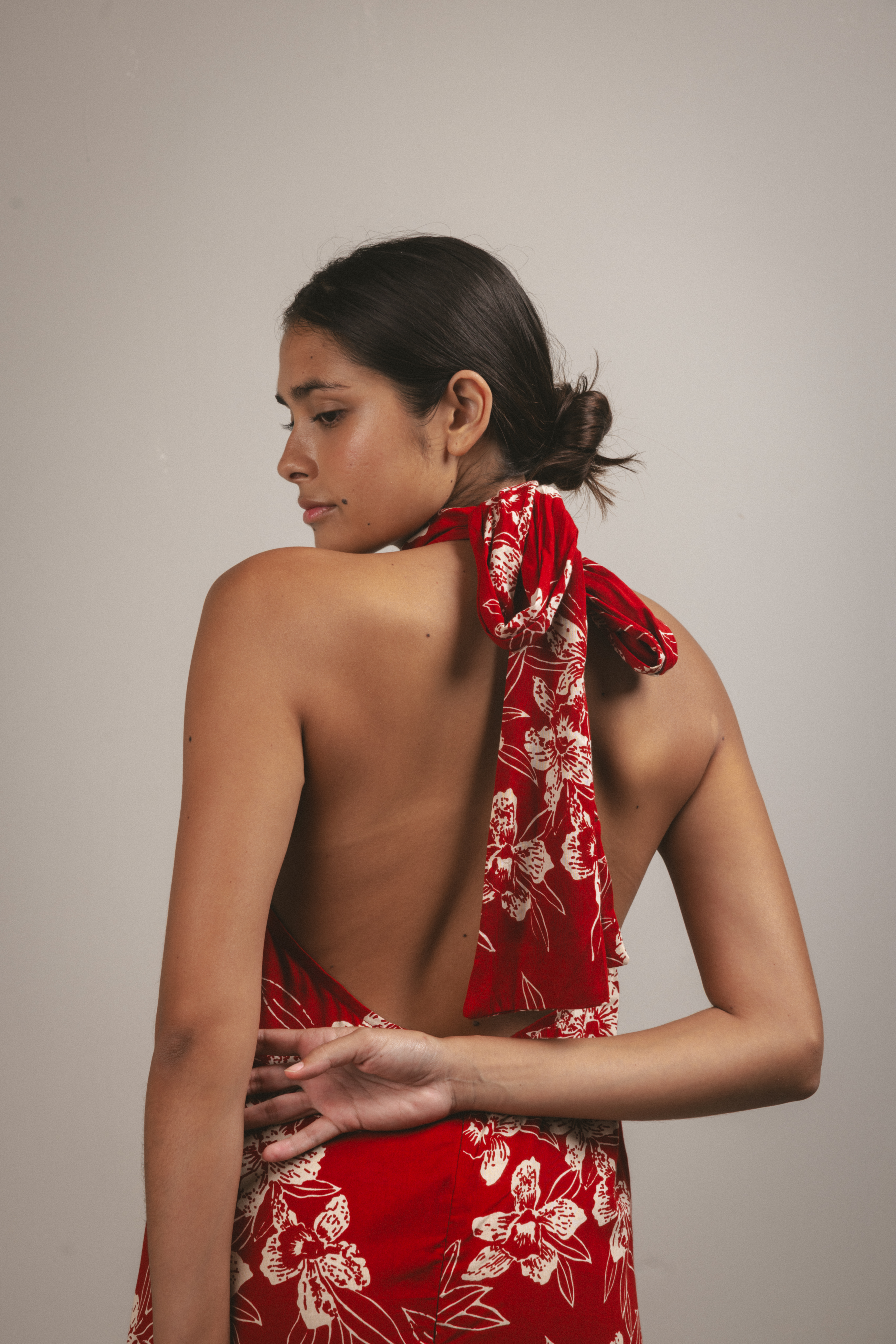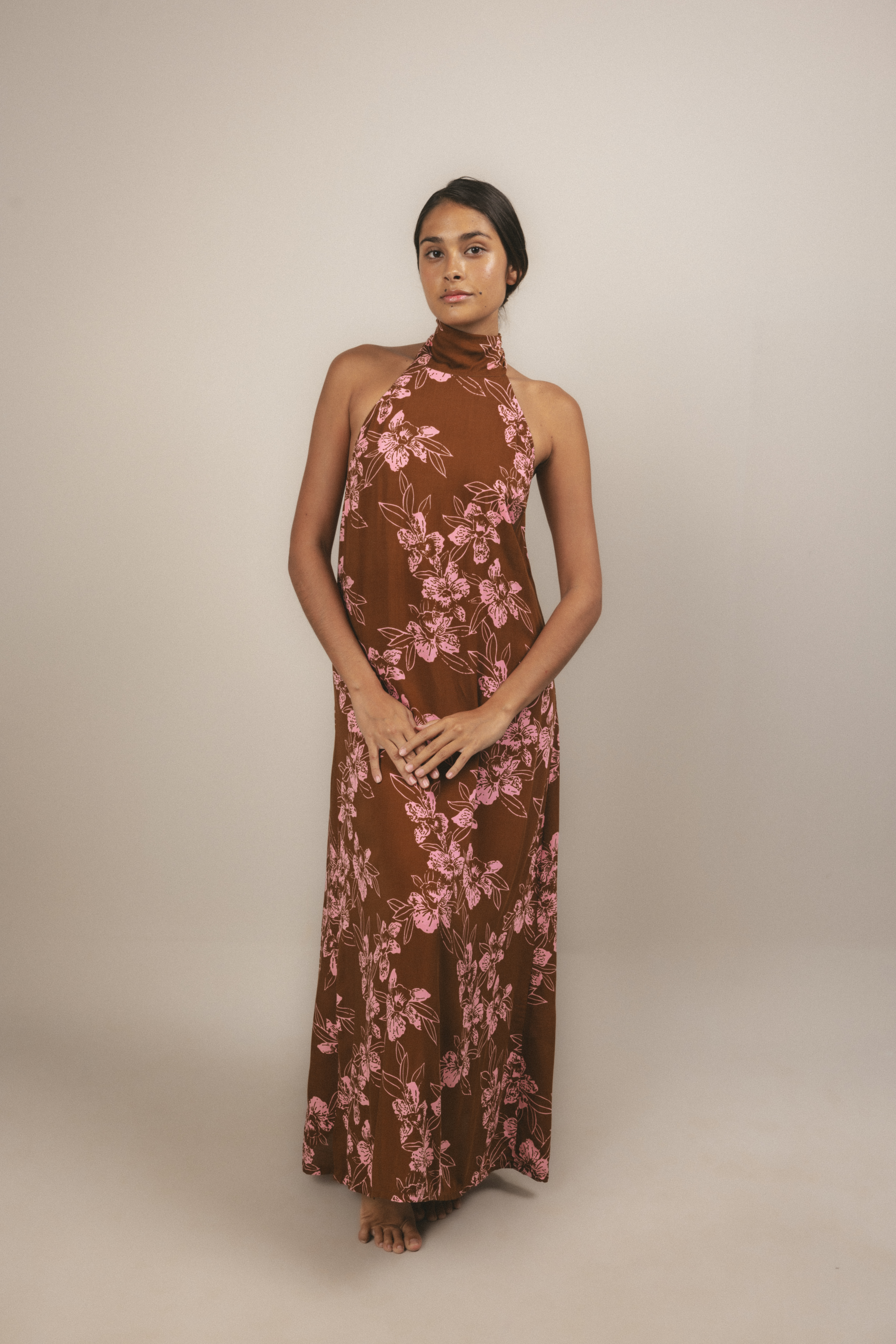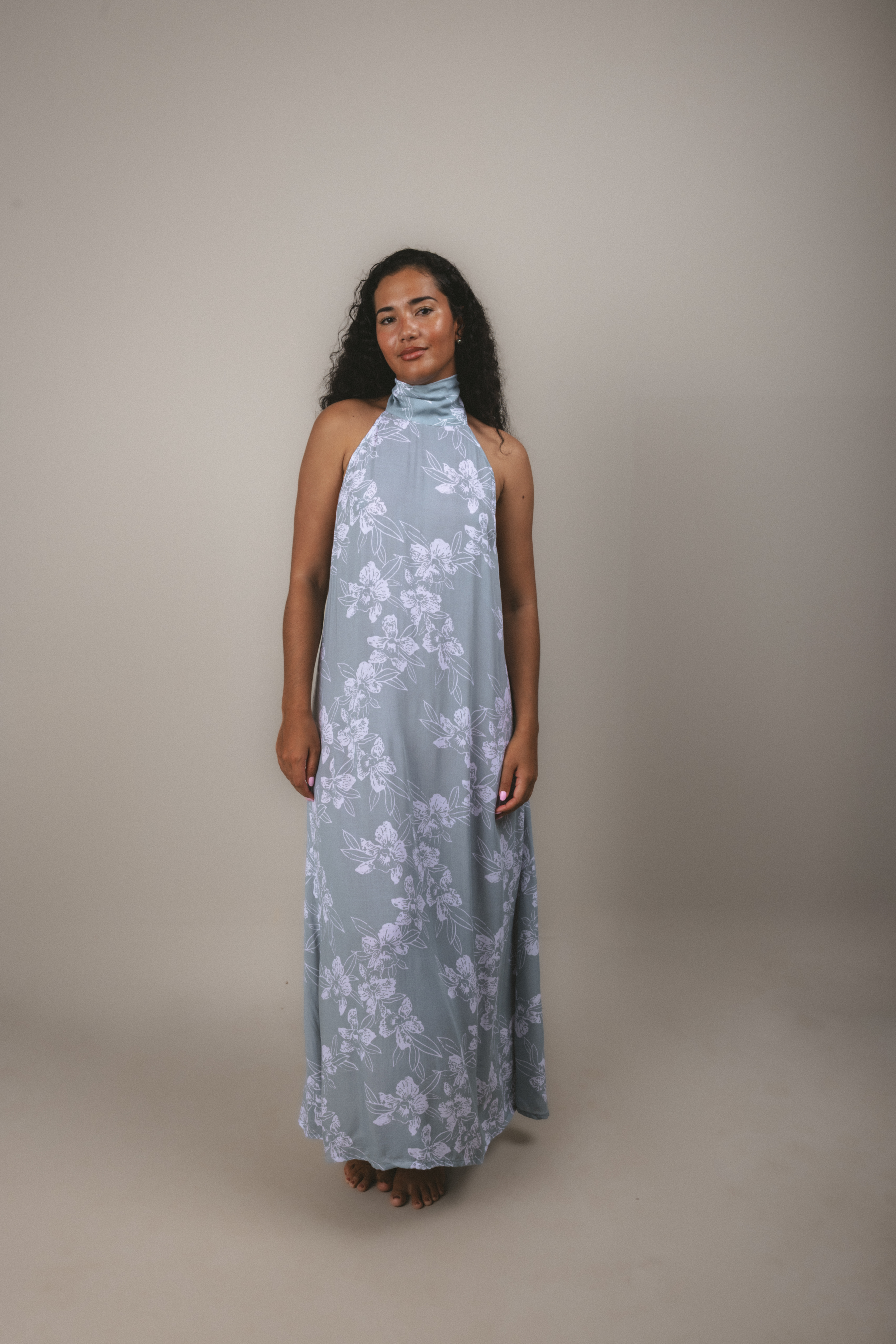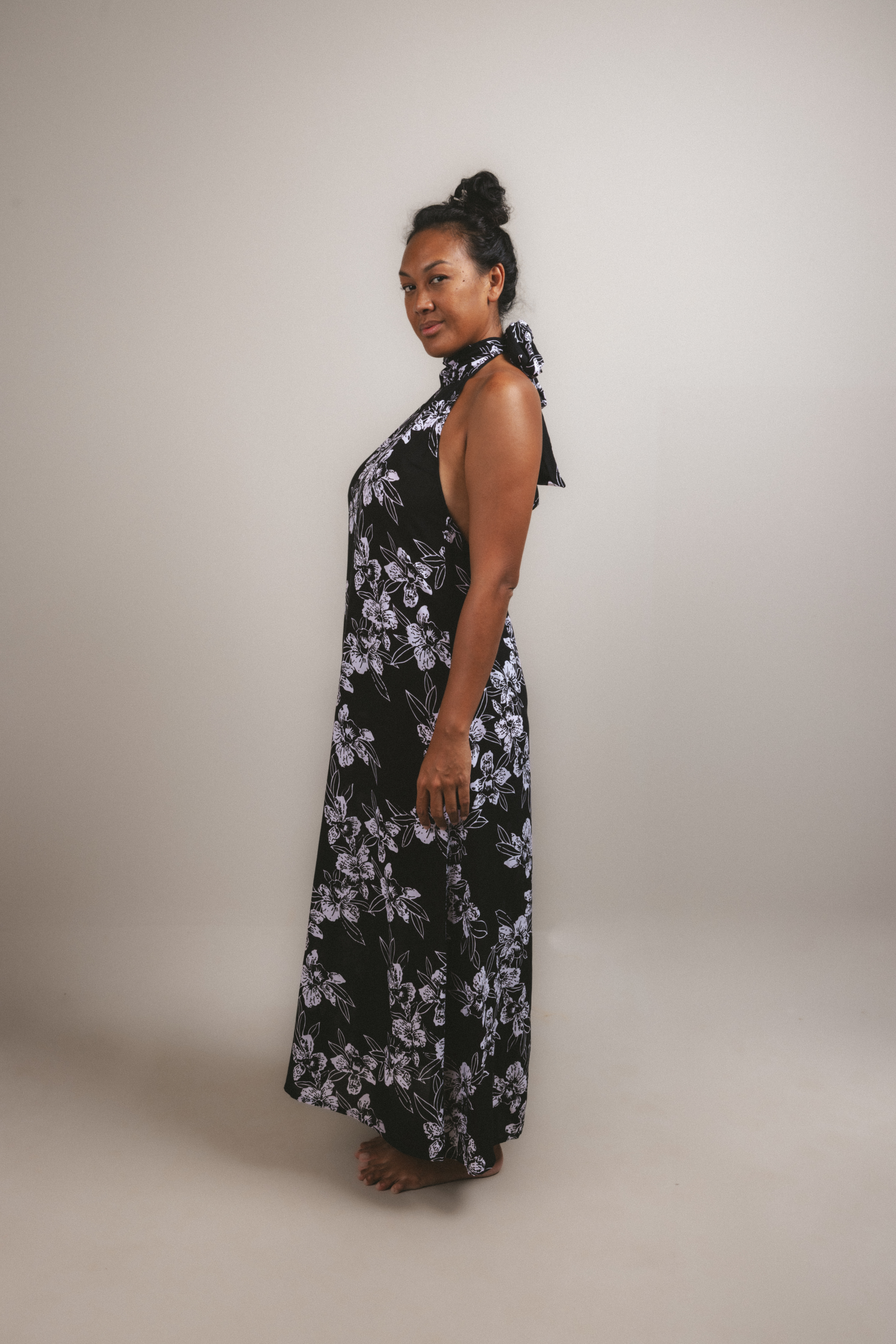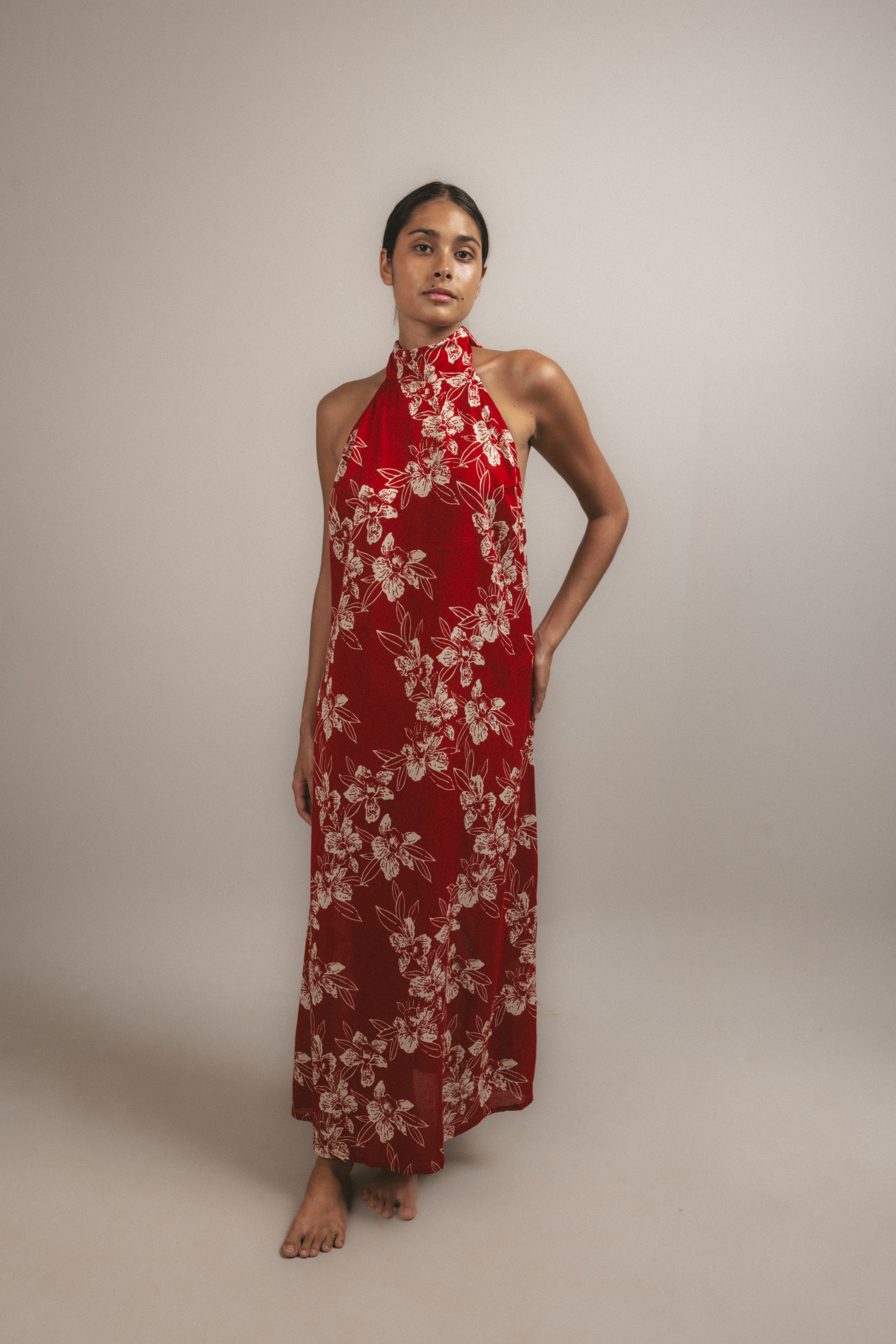 The TAKIAU dress balances boldness with grace. Sleeveless and floor-length, it reveals the back with fluid ease, while long ties at the nape form a cascading bow. A high neckline lends structure, blending sensuality with sophistication. Part of the Matavai Collection, TAKIAU reimagines heritage for the confident woman of today.
